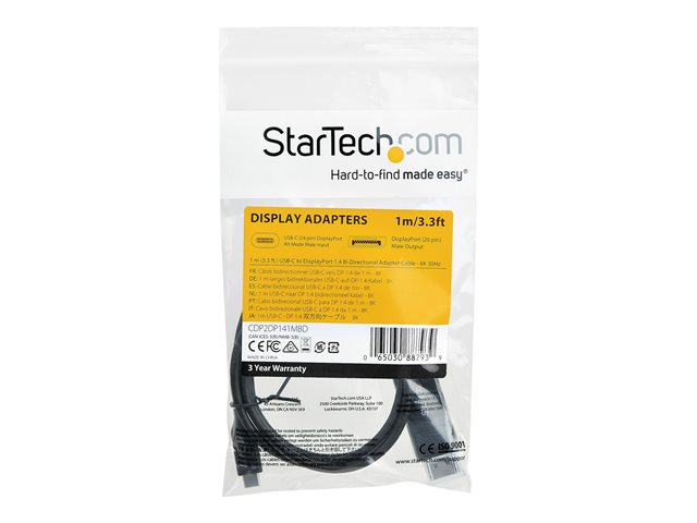 StarTech.com 3ft/1m USB C to DisplayPort 1.4 Cable 8K 60Hz/4K, Bidirectional DP to USB-C or USB-C to DP Reversible Video Adapter Cable, HBR3/HDR/DSC, USB Type C/Thunderbolt 3 Monitor Cable - 8K USB-C to DP Cable (CDP2DP141MBD) - DisplayPort-kabel - USB-C (hann) til DisplayPort (hunn) - USB 3.1 / Thunderbolt 3 / DisplayPort 1.4 - 1 m - aktiv, støtte for 8K UHD (7680 x 4320) - svart CDP2DP141MBD
