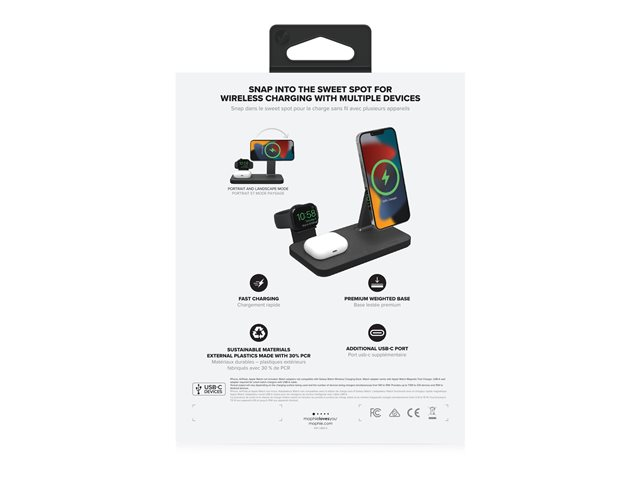 Lad alt. Alt på en gang. Snap+ 3-i-1 har en ladepute for trådløs telefon, en ladepute for trådløs hodetelefon og to klokkeadaptere som lar deg koble til Apple Watch eller Galaxy Smartwatch-laderen. Telefonstativet er MagSafe-kompatibelt og fungerer med ikke-magnetiske telefoner takket være snap-in-adapterringen. Få opptil 15 W strøm for Android-enheter eller opptil 7,5 W strøm for Apple-enheter.