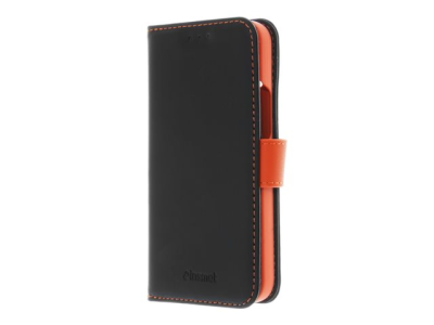 Insmat Exclusive Flip Case - Lommebok for mobiltelefon - ekte skinn, polykarbonat, bomullssting, kartong+papir - svart og oransje - for Apple iPhone 14