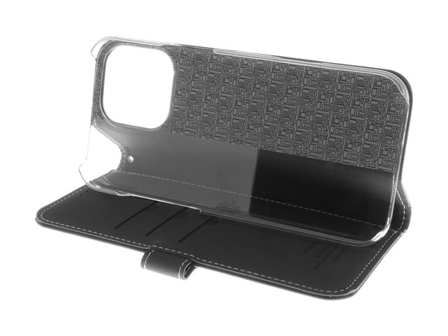 Insmat Exclusive - Lommebok for mobiltelefon - ekte skinn, kartong+papir+aluminiumsfolie, polykarbonat (PC), bomullssting - svart - for Apple iPhone 16 Pro Max 650-3281