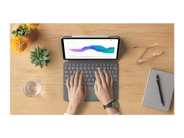 Logitech Combo Touch er designet for sømløs integrasjon med Apple iOS-enheter, og tilbyr et tastatur og et folioetui i en allsidig pakke. Med tilgang til porter og kontroller gir dette etuiet brukerne mulighet til å holde seg tilkoblet og ha kontroll mens de er på farten, noe som gjør det ideelt for produktivitet og kreativitet. Den integrerte Apple-blyantholderen sørger for at du alltid har verktøyene for hånden, noe som gir en bedre brukeropplevelse. Combo Touch har en innebygd styreflate som forbedrer navigasjonen og effektiviteten, og gir en intuitiv måte å samhandle med apper og dokumenter på.