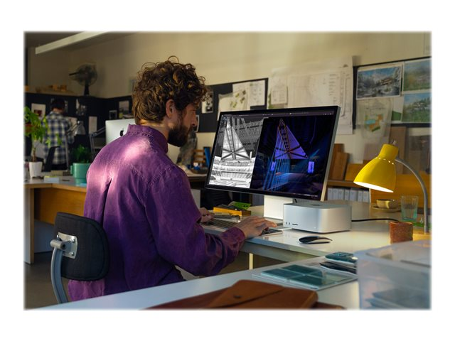 Vi introduserer Studio Display. En oppslukende 27-tommers 5K Retina-skjerm (skjermstørrelsen måles diagonalt) med et 12 MP-kamera med Centre Stage, mikrofoner i studiokvalitet og et lydsystem med seks høyttalere. Passer perfekt sammen med alle Mac-maskiner.
