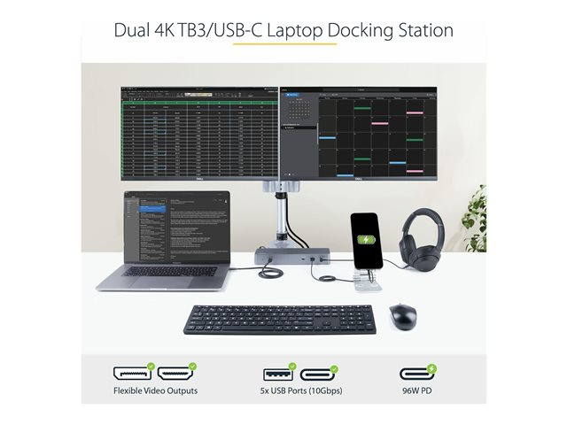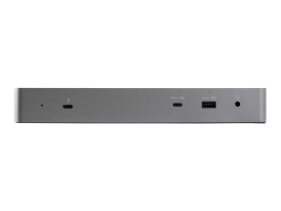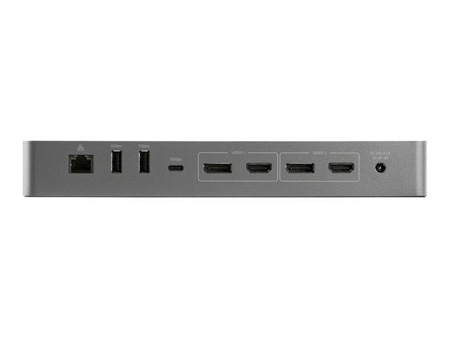 A high-performance Thunderbolt 3 certified docking station with USB Type-C compatibility featuring dual monitor 4K 60 Hz DSC support from either dual or dual HDMI video outputs, 96 W Power Delivery (100 W peak power), 5x USB 3.2 hub with 2x BC 1.2 fast charging ports, Gigabit Ethernet and headset ports.