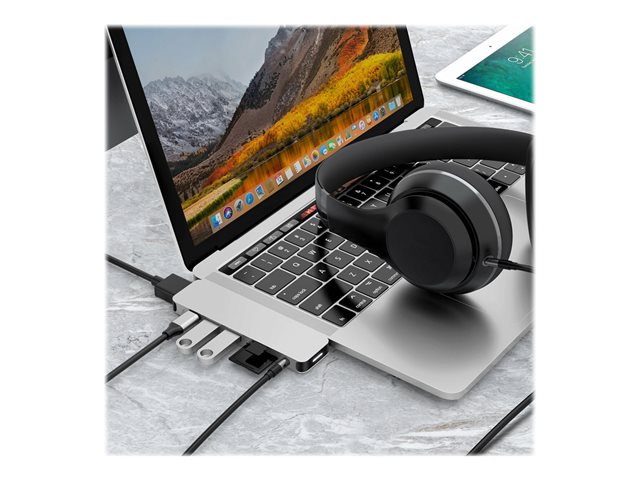 Form-fitting USB-C Hub for MacBook Pro and Air. This USB-C docking station attaches to MacBook adding 8 ports: 4K HDMI output, USB-C power delivery, and more.