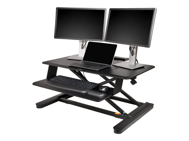 - Professional two-tier structure provides a 35.4in (900mm) wide main desk surface with plenty of room for a dual monitor set-up, documents and other desktop accessories, an integrated keyboard and mouse deck and ergonomically-designed bevelled edges to help reduce contact stress